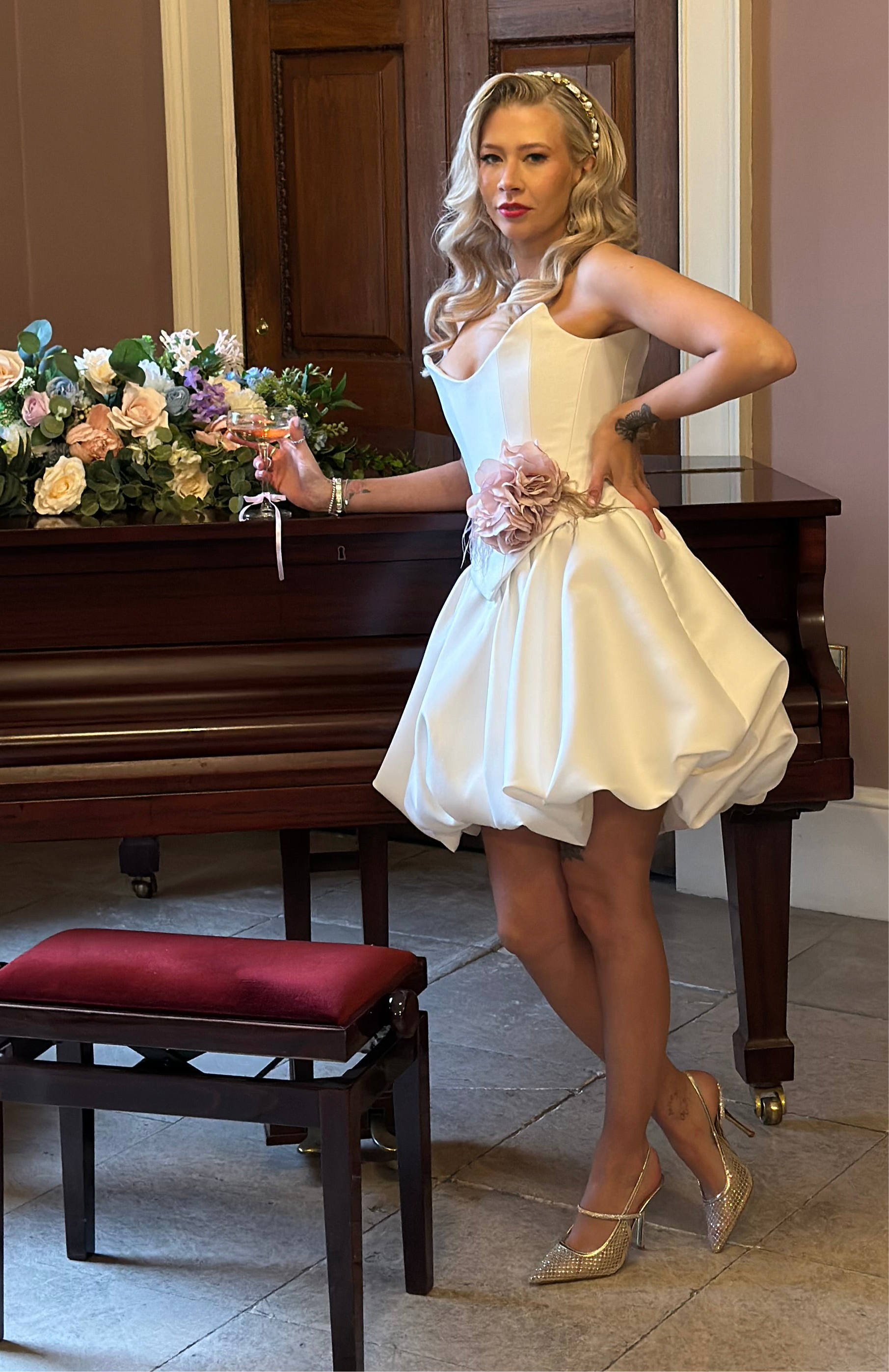 Expertly designed Beatrice separates feature a corset bodice with a cleavage enhancing cut and mikado fabric for a luxurious look. The matching skirt has a playful bubble hem detail and a silk flower embellishment on the waist. Other colors of flowers available upon request.