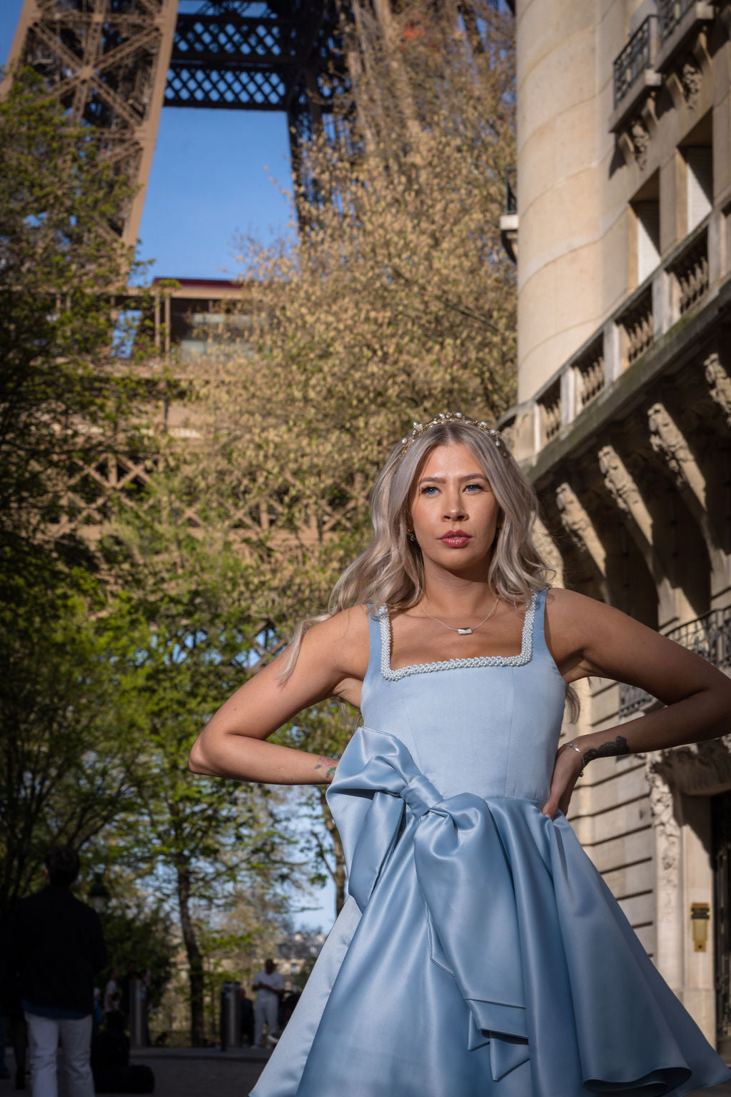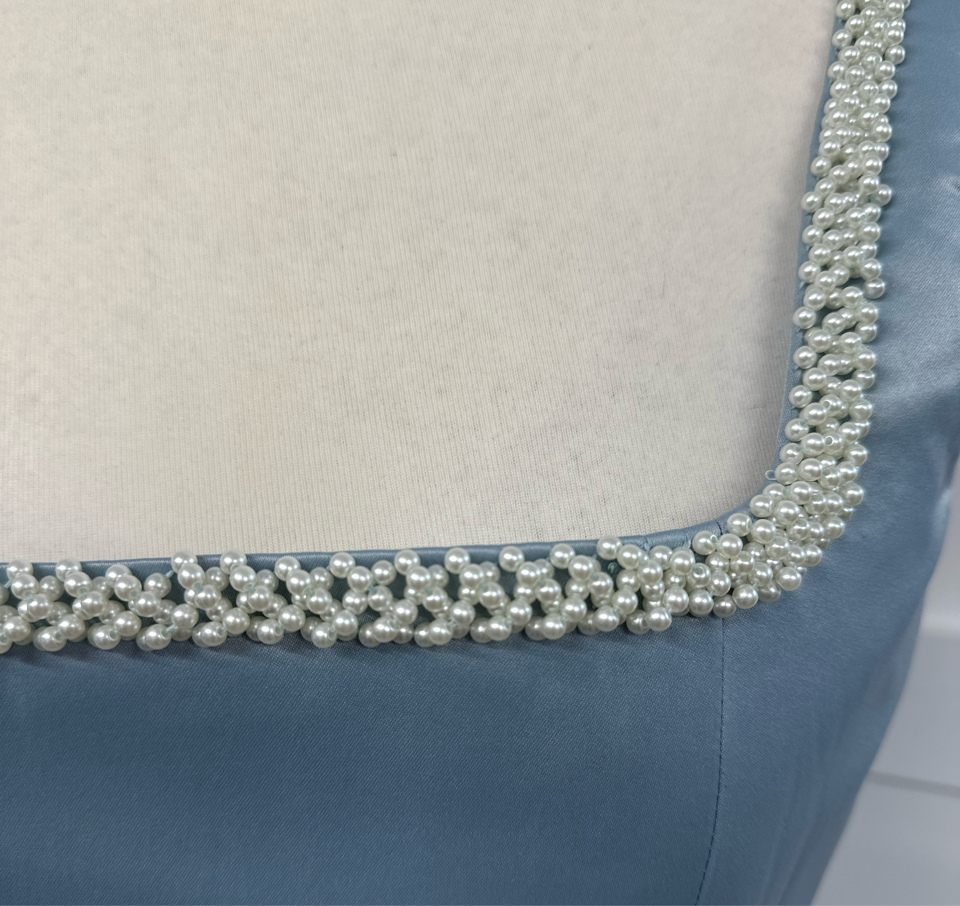 This elegant mini dress features duchess satin for a luxurious feel, along with a square neckline and plaited pearl detailing for a sophisticated touch. With the addition of a large bow at the waist, this dress exudes classic style and grace.